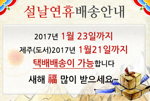 공지사항 2017년 설날 배송 안내 청풍골다슬기 669 2017-01-18 새해 복 많이 받으십시요 설날연휴기간에 주문건은 1월 31일 월요일 일괄배송해 드립니다 감사합니다 목록보기 다음글 오늘 주문했어요 이전글 네이버페이등록